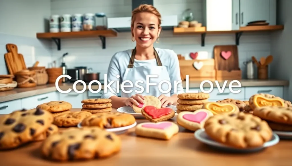 various CookiesForLove cookies displayed in a warm, inviting bakery setting.